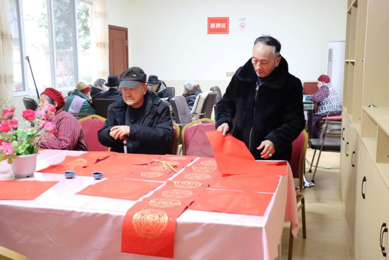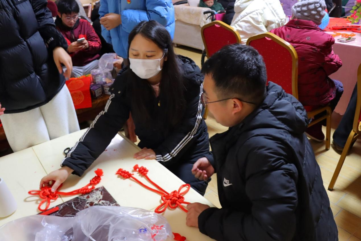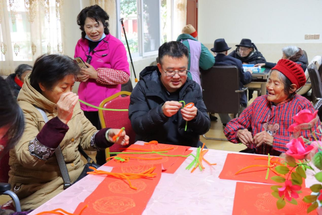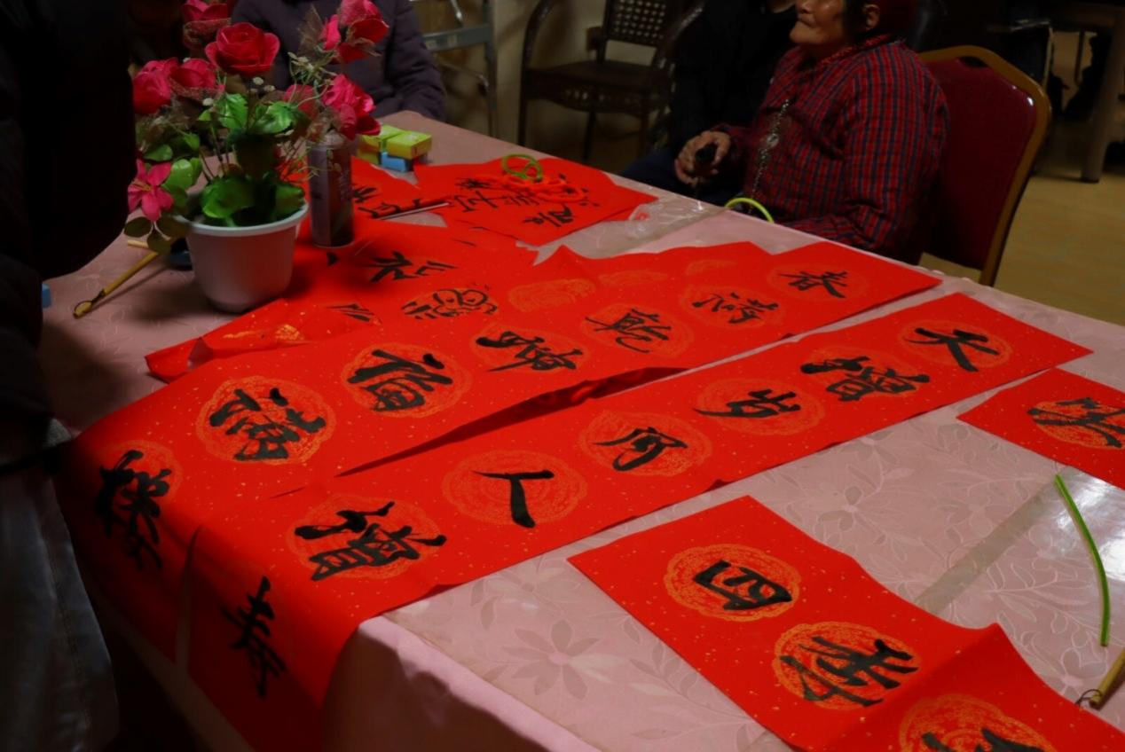 下午的同志与公寓老人一起开展了写“福”字、写对联、打中国结等春节相关传统文化活动,以更好的发扬和传承我国优秀传统文化。同志们先将红纸在桌面上铺开,将毛笔用水浸湿,再蘸上墨汁,于一撇一捺间书写对新年的祝福、对未来的期许。同志们与老人互相学着编制中国结,最后在编好的中国结下面挂上流苏作为装饰,造型十分漂亮。同志们与老人制作了扭扭棒花束手工,将扭好的每一支花束插入花瓶中,寓意着“柿柿如意”、万事胜意。
