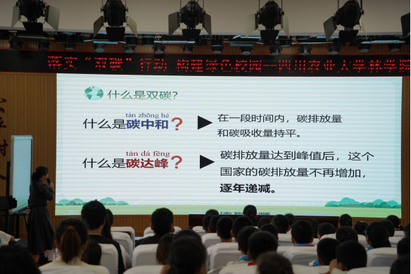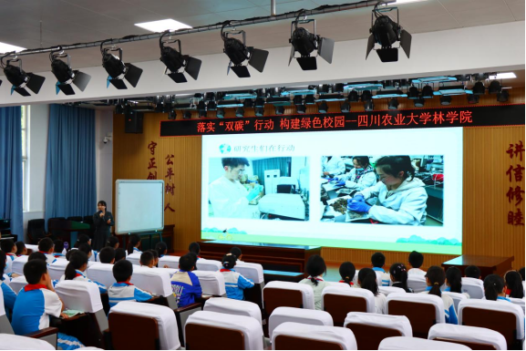 活动之初,宣讲员同志向小学生们讲解了碳达峰、碳中和相关知识,提倡节约用水、节约用电、推广绿色出行等环保理念,通过低碳知识竞答,生动形象地展示了环境保护的重要意义,引导学生在学习生活中做到勤俭节约,争做低碳使者、环保达人。紧接着,支部的党员同志向学生们介绍了9428cn太阳集团研究生们在野外和实验室的经历,展示了农林学子为“践行双碳责任”所做的工作。