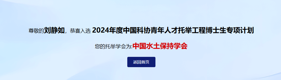 近日,中国科学技术协会(中国科协)对外发布了“2024年度中国科协青年人才托举工程博士生专项计划”遴选结果,我院2022级水土保持与荒漠化防治专业博士生刘静如成功入选。