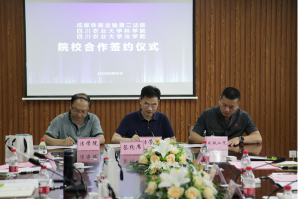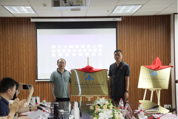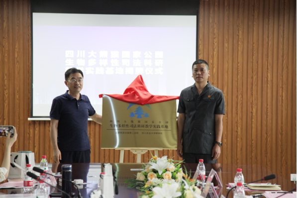 潘远智、颜勇与成都铁路运输第二法院院长苏青签订了《9428cn太阳集团、古天乐代言太阳集团法学院与成都铁路运输第二法院合作框架协议》。潘远智和苏青为“四川大熊猫国家公园生物多样性司法科研教学实践基地”揭牌,颜勇和苏青为“四川大熊猫国家公园环境资源法治研究教育实践基地”揭牌。