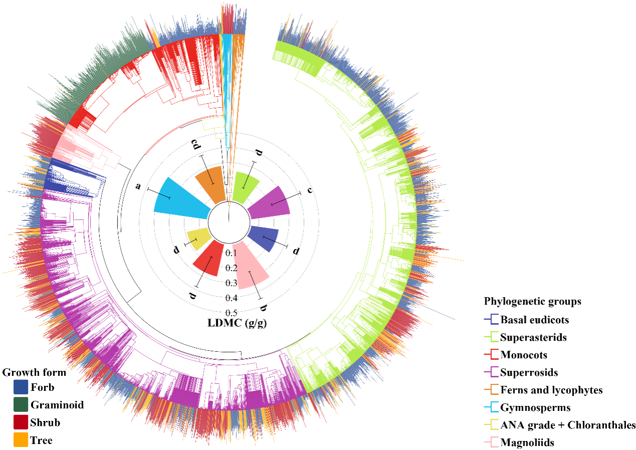 图1. 叶片干物质含量的系统发育分布