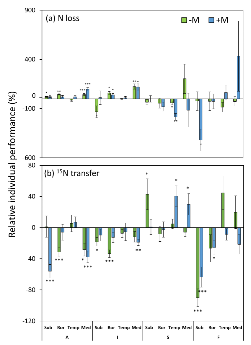 氮是净初级生产的关键元素,陆地生态系统中所需的大部分氮都来自于凋落物分解的再循环。在大的空间尺度上,生物多样性和凋落物分解之间的关系以及调控凋落物分解氮动态的影响因素仍然不明确。该研究将欧洲四种常见的温带树种凋落叶通过单一物种和所有可能的混合移植在北半球四种不同类型的森林中。通过野外原位分解试验,探究了凋落物特性、生物多样性以及分解者群落结构对混合凋落叶分解过程中氮动态的影响。此外,研究还通过低剂量的15N同位素标记了矿质土壤,量化了微生物分解者对氮的固定作用。研究发现单一物种处理中叶片凋落物氮动态(包括氮损失和氮固定)主要取决于凋落物物种特性和当地环境背景。凋落物混合对分解过程中的氮动态有显著影响,混合效应总体上倾向于增加氮损失和减少15N转移。混合物中单个凋落物物种的氮损失不仅取决于凋落物特性和土壤动物,还取决于森林类型;而15N转移则强烈依赖于凋落物混合,独立于凋落物物种丰富度或土壤动物有无。此外,研究还发现无论物种丰富度高低以及小型土壤节肢动物有无,凋落物氮动态均由一小部分凋落物性状驱动。总体而言,研究结果表明凋落物混合对氮动态有显著影响,混合效应主要受森林类型影响,而受凋落物特性、多样性和土壤动物的影响较小。