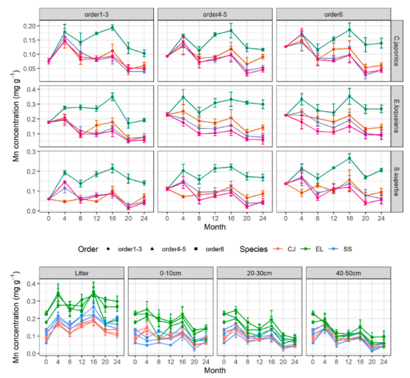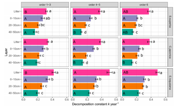 不同的空间位置为根系分解提供了区别于地上凋落物的不同的外部条件,而物种和根序则导致根系基质质量的明显差异。内部和外部条件的差异都可能决定根系的分解速率。为了探讨分解位置、根序和物种差异对根系分解的影响,并确定锰(Mn)在根系分解中的作用,在亚热带森林中的凋落物层以及0−10cm、20−30cm和40−50cm土壤深度处,研究了三个树种根系(分为1−3、4−5和6级根)的分解实验。在两年的分解过程中,测量了根的质量和C、N、P、Mn、缩合单宁和总酚的浓度。