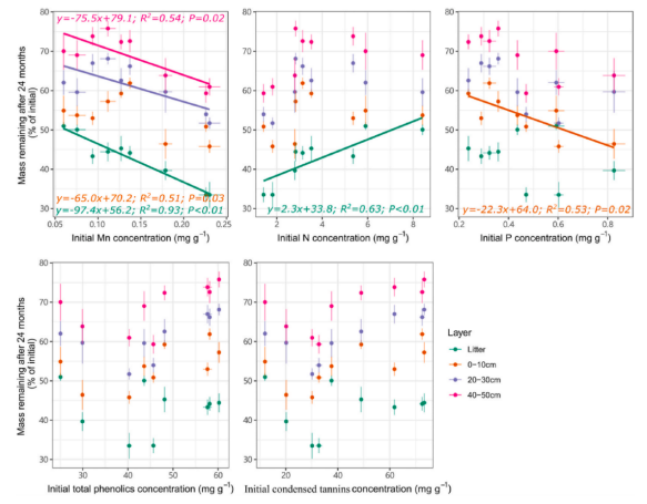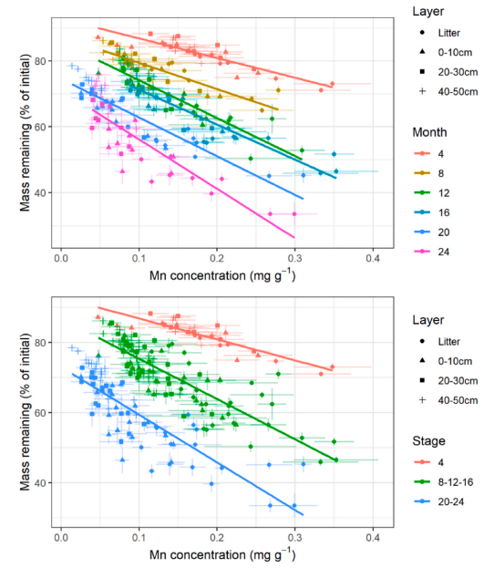 总的来说,该研究有力地表明,根Mn浓度(无论是在初始还是其他分解阶段)与质量残留率的相关性比氮、磷、浓缩单宁或总酚的传统预测因子要一致得多。根Mn浓度极大地指示了土壤层、根序和物种的根分解率。根系初始Mn浓度和分解环境的Mn供应能力共同控制着整个分解过程中的根系分解速率。