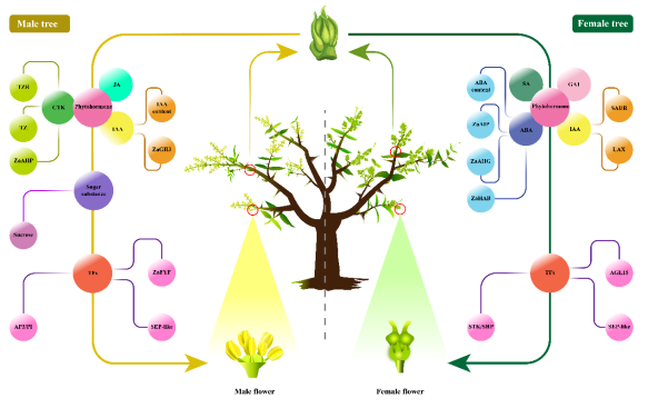 近年来,随着种植面积的不断扩大,以孤雌生殖为主的青花椒陆续发现雌花向雄性转变现象,严重影响青花椒的产业化发展。该研究表明,碳水化合物与细胞分裂素协同作用诱导了雄花的分化,而雌花分化与水杨酸、赤霉素和脱落酸的生物合成与信号转导通路显著相关。同时,青花椒的花器官分化应属于ABCDE模型。本研究是首次结合表型特征、内部解剖结构、基因表达以及生理指标测定,多层次综合剖析了影响青花椒雌雄蕊分化的关键内源因子,为深入揭示青花椒花芽性别决定的遗传调控机制,培育优质高产青花椒种质资源,提供了丰富的理论依据和数据支撑。