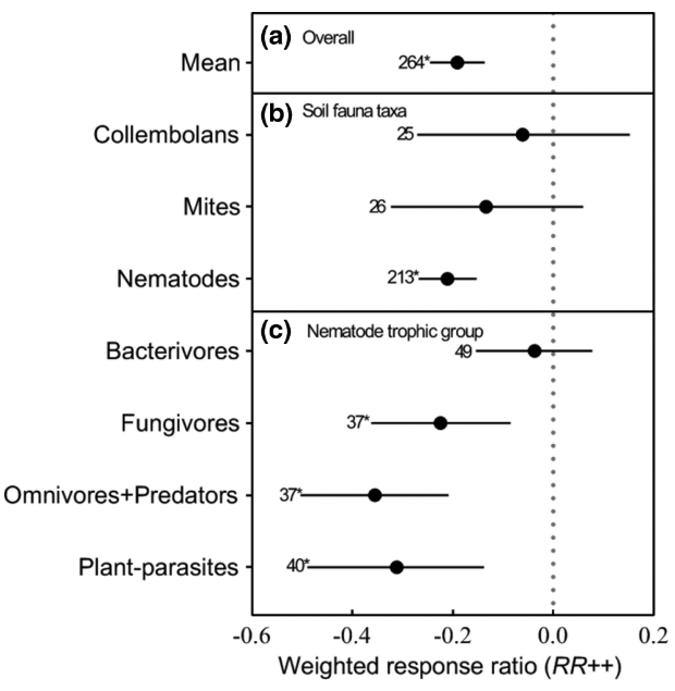 土壤动物群落具有广泛的生态系统功能,大气氮沉降通过改变土壤微环境和生物资源来影响土壤动物的结构和功能,但土壤动物对氮沉降的响应在全球尺度上尚未揭示。研究团队利用整合分析方法,评估了氮沉降对各类群土壤动物丰度的影响。研究揭示了氮沉降对线虫丰度的负面影响(图1)。该研究成果于近日发表于生态学期刊《Global Ecology and Biogeography》(IF:7.148),博士研究生胡峻嶍为第一作者,黄从德教授为通讯作者,古天乐代言太阳集团为通讯单位。