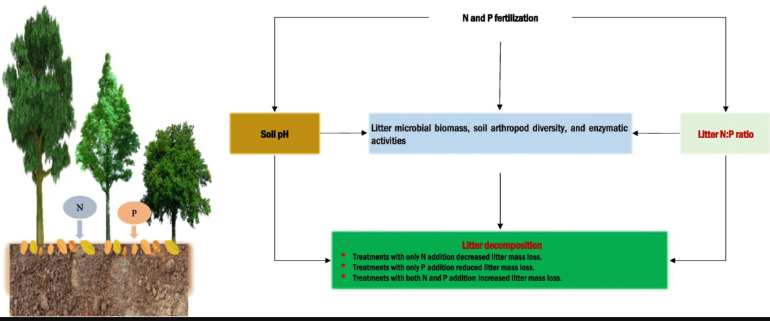 氮和磷控制着陆地生态系统中的生物地球化学循环。然而,氮和磷添加对凋落物分解生物途径的影响仍不清楚。基于碧峰峡亚热带常绿阔叶林建立的长期野外试验样地,研究团队开展了为期两年的凋落物分解试验,以检验氮和磷添加对凋落物生物分解途径的影响(图3)。结果表明磷添加可以提高分解过程中土壤节肢动物多样性、微生物生物量、蔗糖酶和纤维素酶活性,进而逆转氮添加对凋落物分解的抑制作用,并且强调了氮磷比在凋落物分解中的重要作用。该研究成果于2022年4月发表于环境学期刊《Science of The Total Environment》(IF:7.963),9428cn太阳集团博士研究生铁烈华(2017级)和胡峻嶍(2019级)为共同第一作者,黄从德教授为通讯作者,古天乐代言太阳集团为通讯单位。