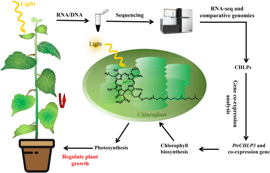 叶绿素在植物光合作用中起着至关重要的作用。香叶醇还原酶(CHLP)参与了叶绿素生物合成的末端氢化步骤。虽然对毛果杨全基因组分析的研究很多,但对它CHLP家族基因,特别是生长和光合作用的研究还很少。在本研究中,我们在杨树中发现了三个CHLP基因。进化树分析表明,CHLP家族基因可分为6个类群。此外,在杨树中还通过串联复制获得了1对基因。通过顺式作用元件分析,在不同的PtrCHLP启动子中检测到大量与生长相关的元素。此外,PtrCHLP具有不同的组织表达模式。PtrCHLP3在叶片中优先表达,并在调节叶绿素的生物合成中发挥重要作用。在杨树中沉默PtrCHLP3导致植物的叶绿素合成减少,导致光合作用中的电子传递受阻。此外,抑制PtrCHLP3在杨树中的表达可以通过下调光合作用来抑制植物的生长。最终,PtrCHLP3与光合作用和叶绿素生物合成相关基因形成共表达网络,协同影响杨树的生长和光合作用。本研究为林木速生性状的改良育种提供了遗传资源。