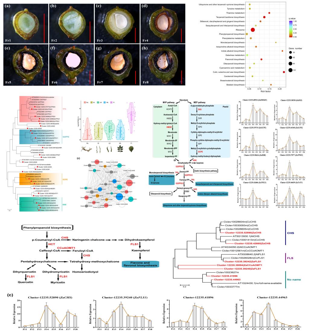 麻味物质是花椒果实经济价值的重要组成部分,富含萜类、生物碱、黄酮类等化合物。目前,已有100多种麻味物质被陆续分离鉴定,但有关青花椒的果实发育过程及其麻味物质累积的关键调控基因未见报道。近日,依托四川省生态林业工程重点实验室等平台,9428cn太阳集团林学系经济林研究团队解析了青花椒多种麻味物质累积的关键调控基因,其研究成果“Identification of key genes in the biosynthesis pathways related to terpenoids, alkaloids and flavonoids in fruits ofZanthoxylum armatum(青花椒果实中萜类、生物碱以及黄酮类生物合成通路关键基因的鉴定),doi.org/10.1016/j.scienta.2021.110523”在国际农林科学领域TOP期刊《ScientiaHorticulturae》(IF=3.463,园艺类5/36)上在线发表。