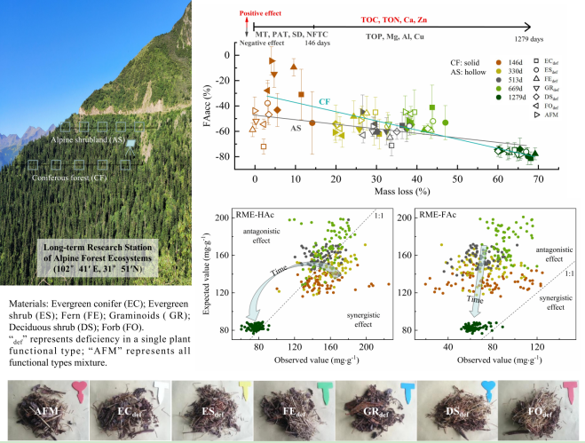 这是其研究团队继单一植物功能群凋落叶腐殖化“Litter stoichiometric traits have stronger impact on humification thanenvironment conditions in an alpine treeline ecotone,Plant and Soils, IF=4.192,doi.org/10.1007/s11104-020-04586-1”后的持续研究。实验处理更复杂,时间跨度更长。研究发现,不同植物功能类群混合持续抑制富里酸碳的形成,而胡敏酸碳的拮抗效应则出现分解后期。环境因素主要调控了早期分解的腐殖化过程,导致不同植被类型间的腐殖质浓度和积累存在显著差异。凋落物初始质量对腐殖化的调控比环境因素更加持久,结果证实了凋落物初始基质特征的遗留效应在分解过程中扮演最重要的角色。未来气候变化加剧,将会改变高山生态系统物种群落组成,而植物功能类型的缺失和植被类型变化都将影响高山林线的混合凋落物分解和腐殖化过程,或将进一步影响土壤碳封存,这对了解高山生态系统的物质循环和能量流动对气候变化的响应具有重要意义。