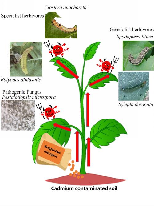 元素防御假说认为重金属元素对昆虫和病原物具有一定的生物学毒性,当其被植物吸收并富集在体内后可以增强植株的抗虫和抗病能力。但是对于林木等低富集植物来说,过量的重金属富集可以反过来对植株的生长发育产生毒害作用。因此,重金属的负面作用极大限度地妨碍了元素防御假说在林木上的适用性。基于林恬恬团队前期研究成果,本论文首次提出向受重金属胁迫的杨树增施外源氮素,可以在增强杨树对胁迫的耐受性的同时促进重金属在植株体内的富集,从而提高植株的抗虫和抗病能力。本研究以滇杨为研究对象,在室内控制条件下开展了专食性和广食性昆虫的生长发育以及选择行为的实验,并结合叶片病原菌的接种实验,分别研究了在不同浓度氮镉处理下的滇杨植株对不同类型昆虫幼虫的生长发育、采食选择及病原菌侵染的影响。研究结果发现在一定浓度内施加外源氮素,可以有效缓解镉胁迫对杨树植株的毒害作用,并显著增强了杨树的抗虫性和抗病性。该研究结果可以为增强重金属污染地内林木的抗性提供新的思路和方法。今年初,陈佳平同学曾以共同第一作者身份在国际环境科学与生态学领域Top期刊《Chemosphere》(2019年影响因子为5.778)上发表研究论文,首次验证了元素防御假说在林木上的适用性,并为本论文研究工作的开展提供了坚实的理论基础。
