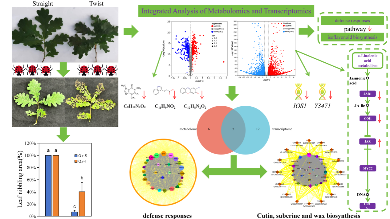 夏栎(Quercus robur)是一种生态经济多用途树种。叶片卷曲对适应环境压力至关重要,但这一特性对植物-昆虫相互作用的影响仍不清楚。研究团队比较了欧洲夏栎卷曲叶(Qr-T)和平整叶(Qr-S)品种的抗性表型、代谢组图谱和转录组数据。研究发现,卷曲叶在草食昆虫作用下叶面积消耗较高。代谢组学分析发现,卷曲叶的关键防御性化合物(如Questiomycin A、Caffeine和Indoleacrylic acid)含量较低。转录组学发现,在卷曲叶中,与发育相关的差异表达基因上调,而与防御相关的基因下调。GO和KEGG分析表明,卷曲叶中的防御反应和异黄酮生物合成途径受到抑制。共表达网络分析发现,在卷曲叶中,防卫相关基因 (如CYP81Q32和CYP94A5)及其共表达转录因子(如WRKY6和WRKY53)协调下调。综上,欧洲夏栎叶片卷曲会削弱其抗虫性,这为提高农林业中植物的抗虫性提供了新的线索。