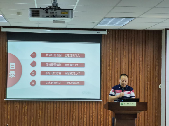 王东强老师从传承红色基因、坚定理想信念;厚植爱国情怀、担当复兴大任;感念母校恩情、我辈致知力行;矢志明德成才、开启似锦年华四个方面,结合长征途中的传奇数据和川农大精神,精彩讲述了爱国精神的重要性和必然性,以我国目前在各领域的瞩目发展引申出“爱国为青春底色,爱校为青春画笔”,号召青年学子以身作则,将爱国爱校融入实际行动中,在服务国家和社会中成就大业,肩负起时代赋予的历史使命。