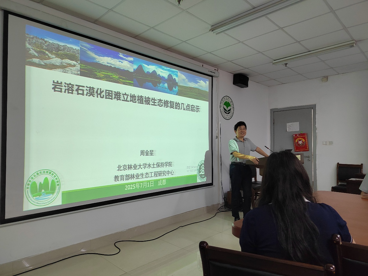 报告中,周金星教授针对西南困难立地条件下石漠化生态修复问题,讲述了困难立地条件研究的背景,以及喀斯特植被对极端复合干旱的响应机制等内容;秦伟教授级高工则对当前小流域侵蚀产沙模型因子优化及植被格局与侵蚀关系等内容展开讲授。